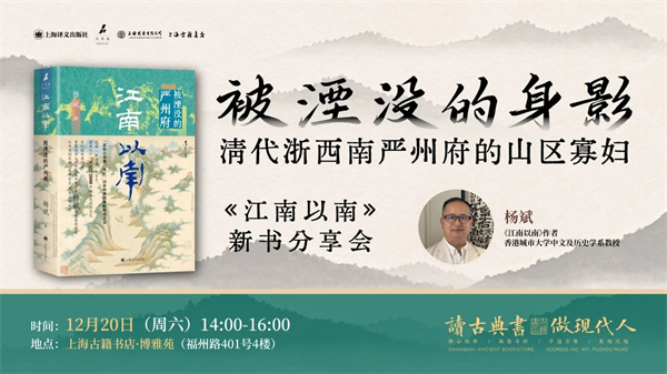 《江南以南:被湮沒的嚴(yán)州府》是學(xué)者楊斌撰寫的一部視角獨(dú)特的地方史,從浙西南山區(qū)小縣建德的地理獨(dú)特性切入,探討該地在國家建構(gòu)與跨國交流中的歷史位置。12月20日下午,楊斌教授將做客上海古籍書店,以“被湮沒的身影:清代浙西南嚴(yán)州府的山區(qū)寡婦”為講座主題,邀請(qǐng)廣大歷史愛好者、文化研究者共同走進(jìn)“她們”的世界。