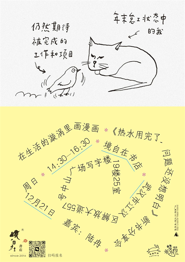 漫畫要畫,生活本身更要繼續(xù)。12月21日,陸冉帶著新書《熱水用完了,問題還沒想明白》來到武漢境自在書店,與大家分享漫畫背后的靈感來源。