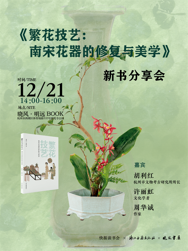 你是否好奇,碎成十九片的南宋官窯花觚,如何在修復(fù)師手中重歸完整?你是否想知道,分離八百年的鳳耳瓶殘軀,為何能在現(xiàn)代庫房里意外 “重逢”?當(dāng)青瓷釉色遇見宋代插花,當(dāng)修復(fù)技藝碰撞生活美學(xué),一場(chǎng)跨越時(shí)空的對(duì)話即將開啟。12月21日,《繁花技藝:南宋花器的修復(fù)與美學(xué)》新書分享會(huì)將在曉風(fēng)·明遠(yuǎn) BOOK溫情啟幕。讓我們跟隨三位嘉賓,一同走進(jìn)南宋花器的修復(fù)現(xiàn)場(chǎng),感受文物重生的力量與宋代風(fēng)雅的余韻。