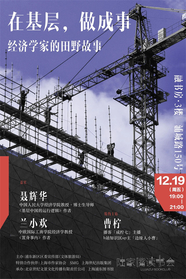 在基層,做成事,意味著什么?12月19日晚,兩位經(jīng)濟(jì)學(xué)家——《基層中國的運(yùn)行邏輯》作者聶輝華和《置身事內(nèi)》作者蘭小歡,將一起做客陸家嘴讀書會(huì),本場(chǎng)活動(dòng)特邀“咸檸七”主播曹檸主持,一起聊聊在制度、人情與發(fā)展的縫隙中,事情究竟如何做成,以及理論的銳度與現(xiàn)實(shí)的厚度如何對(duì)話。