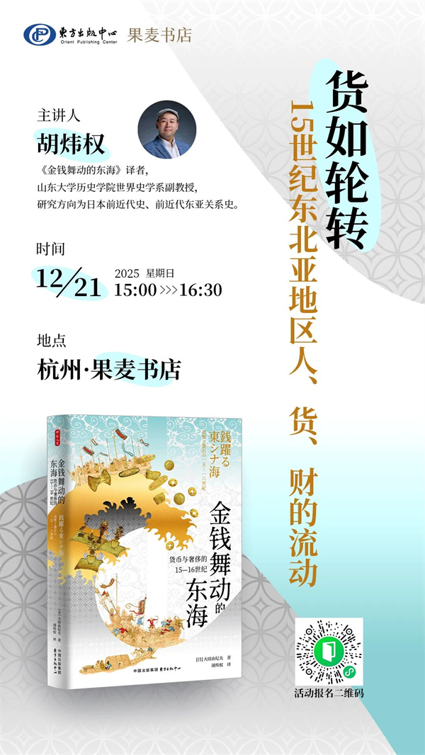 在被稱為明代“海禁”的年代,海上往來真的停息了嗎?15世紀(jì)的東北亞,商船依舊穿梭,貨物流轉(zhuǎn)不息,各種貨幣與奢侈品在暗流中交換,構(gòu)成了一幅活躍的區(qū)域交流圖景。本次講座中,《金錢舞動(dòng)的東?!返淖g者胡煒權(quán)將帶領(lǐng)聽眾走進(jìn)“大航海時(shí)代”前夜的東北亞世界,重新認(rèn)識(shí)一個(gè)并不封閉的“海禁”時(shí)代,探討那些在風(fēng)浪中重構(gòu)前近代東北亞格局的力量。