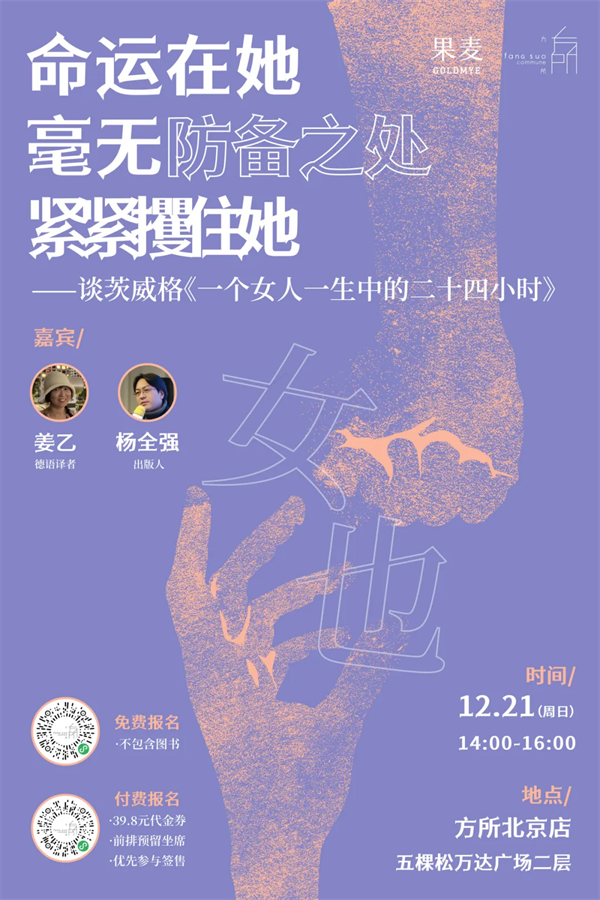 德語作家茨威格被稱為“靈魂的獵手”,他擅長(zhǎng)用細(xì)膩的文字探索人內(nèi)心的密林。在名篇《一個(gè)女人一生中的二十四小時(shí)》中,他把一位長(zhǎng)久壓抑自己的女性直面欲望時(shí)那種瘋狂與掙扎盡數(shù)呈現(xiàn)。當(dāng)命運(yùn)用偶然扼住一個(gè)人又徹底顛覆她時(shí),人的膽怯與勇敢如影隨形,堅(jiān)定與搖擺相繼顯現(xiàn),神性與人性化于一體,被捕獲與被放生亦相伴而生。命運(yùn)之偶然成為一種必然。12月21日,我們邀請(qǐng)到《一個(gè)女人一生中的二十四小時(shí)》譯者姜乙與出版人、河南大學(xué)教師楊全強(qiáng)做客方所北京店,與讀者一同走進(jìn)茨威格筆下的心靈世界。