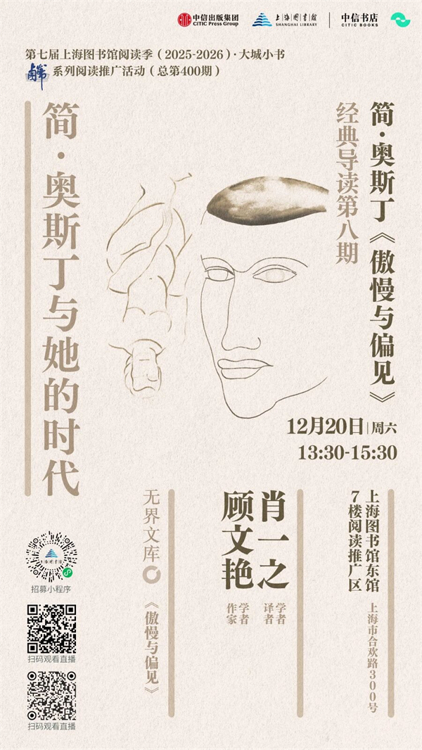 簡(jiǎn)·奧斯丁的作品究竟有何種魔力,讓生活于世界范圍內(nèi)的人們?cè)?00多年間不斷地閱讀、觀看、討論?現(xiàn)實(shí)主義元素如金錢、財(cái)產(chǎn)、階層等,如何通過浪漫主義元素如愛情在作品中被呈現(xiàn)?在奧斯丁的作品里,我們看到了怎樣的社會(huì)景觀,讓我們?cè)陂喿x時(shí)不自覺地代入自身所生活的時(shí)代?我們特約學(xué)者顧文艷和肖一之,作為導(dǎo)讀人,于12月20日,和讀者一起重返“簡(jiǎn)·奧斯丁與她的時(shí)代”,通過《傲慢與偏見》等作品,共同討論這些議題。
