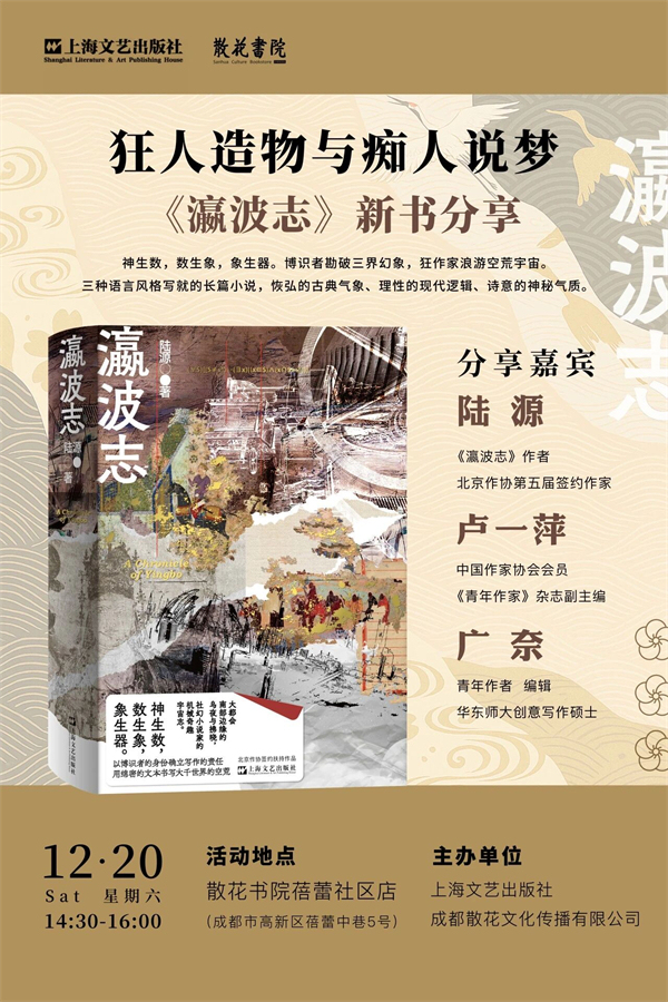 12月20日,陸源將攜新作《瀛波志》,與盧一萍、廣奈兩位嘉賓一起做客散花書院蓓蕾社區(qū)店,分享這部長(zhǎng)篇小說。