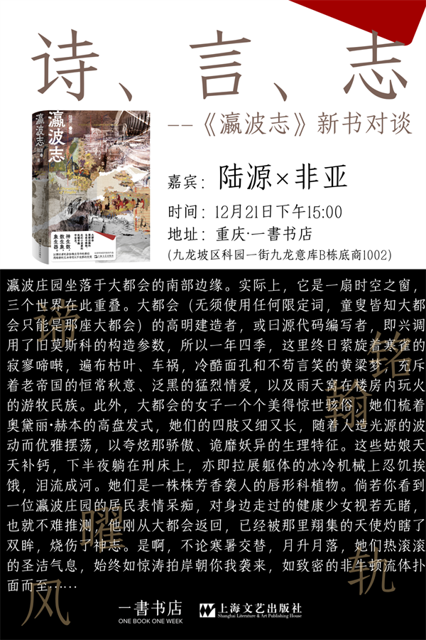 《瀛波志》是作家陸源的新作。乾坤入暮,那些匆匆趲行的使徒、神秘學(xué)家、詩人、畫家、狂作家、星象家、史學(xué)博士與孤孑夜行者相伴相攜,化為浩渺的星緯間愣愣怔怔的微型天體,時(shí)光之輪永轉(zhuǎn),直至苦海成空。12月21日,陸源將做客重慶一書書店,與嘉賓、詩人、建筑師、小說寫作者非亞一起,解讀這部小說。