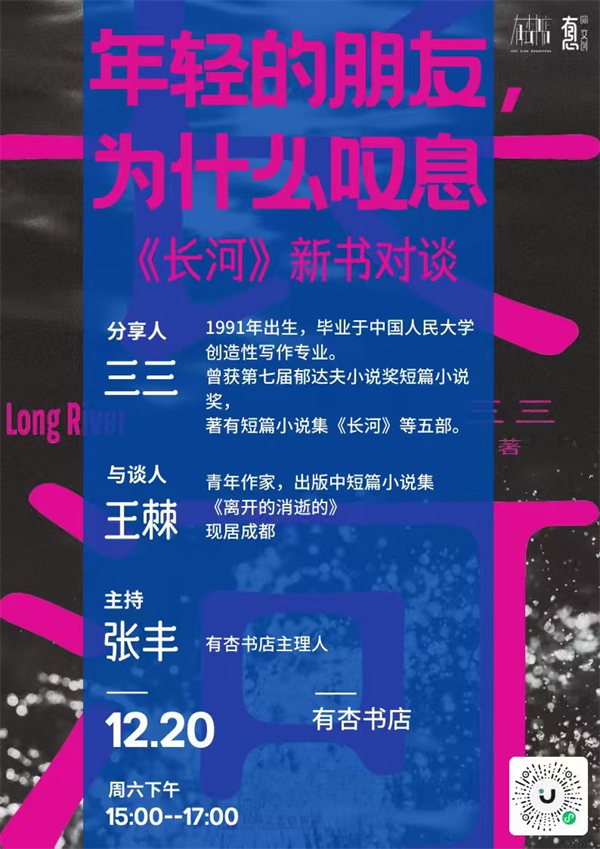 本周六下午,作家三三將帶著新作《長(zhǎng)河》做客有杏書店,與嘉賓、作家王棘,以及嘉賓主持張豐,一起談?wù)勥@部小說集。