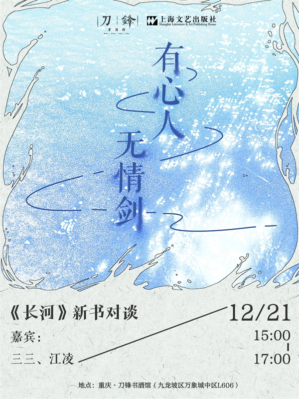 作家三三繼《晚春》后全新冷感敘事小說集《長(zhǎng)河》,九個(gè)關(guān)于愛與存在的故事,獻(xiàn)給朝向世界不再回頭的我們。12月21日下午,她將帶著新作做客重慶,與刀鋒書酒館主理人江凌對(duì)談。