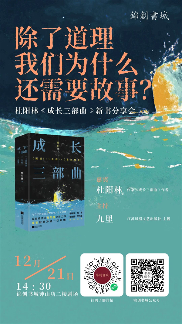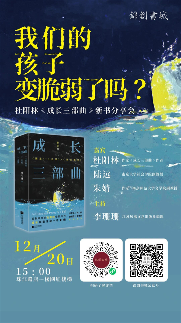 12月21日下午,杜陽林將攜新作《成長(zhǎng)三部曲》來到錦創(chuàng)書城鐘山店,與讀者一同探討成長(zhǎng)中的困境與希望,分享創(chuàng)作中的感悟和軼事。