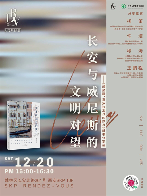 12月20日,《威尼斯,貢多拉劃過的歲月》作者柳笛,西安培華學(xué)院中文系、西安音樂學(xué)院人文學(xué)院教授,文藝評(píng)論家仵埂,中國散文學(xué)會(huì)副會(huì)長(zhǎng)、陜西省文藝評(píng)論家協(xié)會(huì)副主席、西安市作家協(xié)會(huì)主席穆濤,西北大學(xué)文學(xué)院教授、博士生導(dǎo)師,中國小說學(xué)會(huì)理事、中國當(dāng)代文學(xué)研究會(huì)理事王鵬程共同做客西安SKP,共話從長(zhǎng)安古垣到威尼斯水韻。本書作者柳笛以貢多拉的悠悠槳聲為引,為我們開啟一場(chǎng)跨越時(shí)空的水城漫游。
