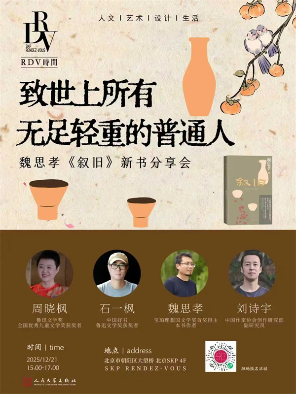 作為深耕鄉(xiāng)土與平民敘事十余年的作家,魏思孝的文字始終帶著土地的粗糲與溫度。從《王能好》里“放大的閏土”,到《土廣寸木》里的鄉(xiāng)村眾生相,他筆下的小人物總能戳中人心里最柔軟的角落;而最新創(chuàng)作的小說集《敘舊》,則是他從“鄉(xiāng)村紀(jì)錄片” 向“生命回憶錄”的溫情轉(zhuǎn)身。12月21日下午,我們特別邀請(qǐng)著名作家周曉楓、石一楓,和魏思孝一起做客SKP,在文字的溫度里,重拾對(duì)平凡人生的敬意。這一次,我們不談宏大命題,只敘凡人煙火,致敬每一個(gè)“無足輕重”卻無比珍貴的你我。