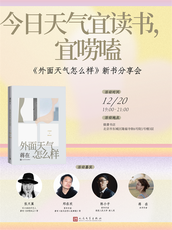 當(dāng)北京的冬夜裹緊霓虹,當(dāng)?shù)罔F閘機(jī)記錄著步履匆匆,當(dāng)你在辦公樓的格子間里修改方案,抑或是站在出租屋窗前望著遠(yuǎn)方,會(huì)不會(huì)忽然在心中浮現(xiàn)一句:外面天氣怎么樣?青年作家蔣在的全新小說集《外面天氣怎么樣》,試圖替無數(shù)在都市的漂泊者,寫下答案。12月20日晚,我們想邀你在做書書店,和青年作家張?zhí)煲怼⑧嵲跉g、陳小手,以及《外面天氣怎么樣》的作者蔣在一起,赴一場(chǎng)冬夜之約。我們會(huì)圍著新書聊起那些故事里的掙扎,也會(huì)跳出書頁,聽作家們講講自己的北漂往事。