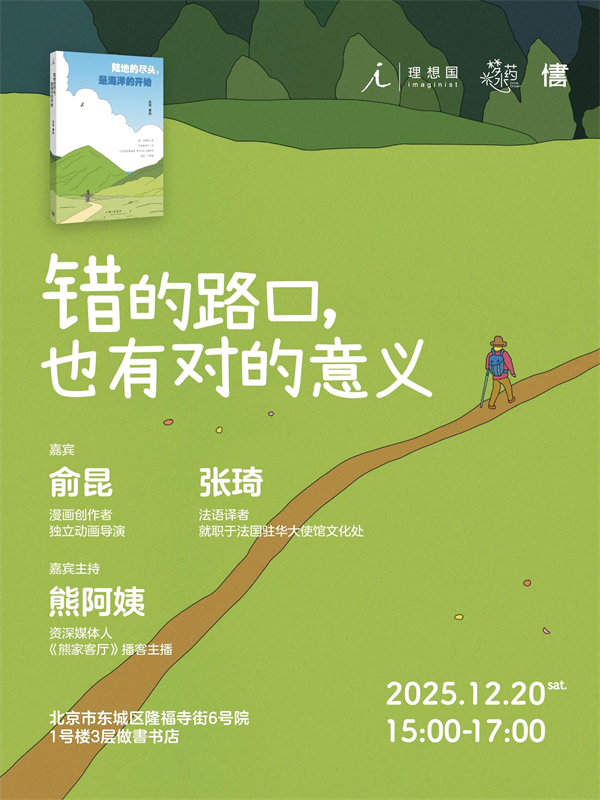 回家還是留下,哪個(gè)才是更好的選擇?十年前,從法國動(dòng)畫專業(yè)畢業(yè)的俞昆,帶著“自討苦吃”的勇氣踏上了橫穿西班牙的“朝圣之路”。1000公里的徒步之旅中,她遇到了形形色色的人:辭職的公務(wù)員、休學(xué)的少年、收集擁抱的女孩、通過徒步來慶祝結(jié)婚紀(jì)念日的西班牙老夫婦……12月20日下午,俞昆將和法語譯者張琦、《熊家客廳》播客主播熊阿姨一起聊聊徒步路上的見聞,回望人生中那些(看似)重要的選擇。