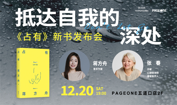 有沒有哪個(gè)瞬間,你覺得自己好像活錯(cuò)了?也許是選擇了不喜歡的專業(yè),也許是走入了不想要的關(guān)系,又或者,生活的一切看似順?biāo)?,但?nèi)心始終隱隱覺得不對(duì)勁?!拔铱赡芑铄e(cuò)了?!边@是35歲后,蔣方舟對(duì)自我的叩問,也是小說《占有》的起點(diǎn)。書中以母女關(guān)系為藍(lán)本的女性書寫,寫出了東亞女兒們相似的命運(yùn)挑戰(zhàn)。12月20日,蔣方舟將做客PAGEONE書店(五道口店),與作家、心理咨詢師張春對(duì)談。她們會(huì)聊聊《占有》中的女性敘事,也聊聊抵達(dá)自我深處時(shí)所見的風(fēng)景,傾聽那些通往自我途中,我們都有的坎坷心事。