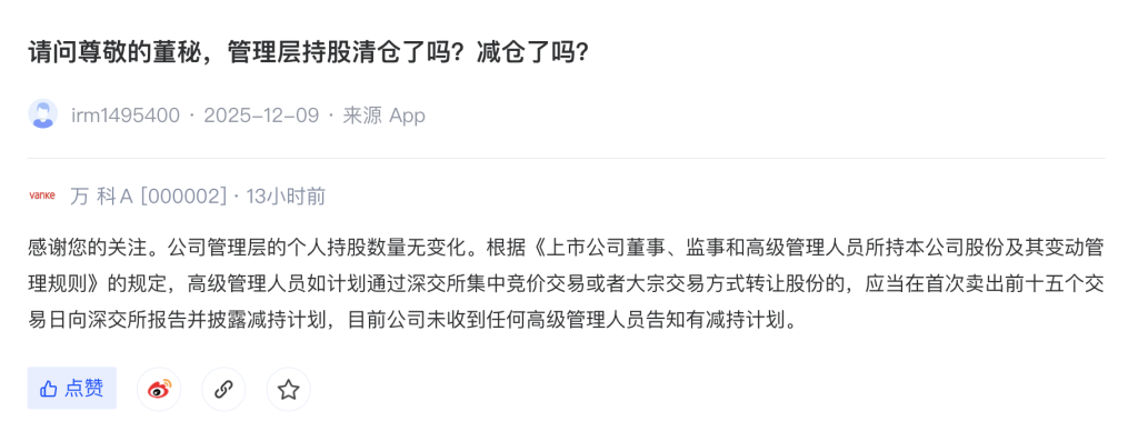 12月18日,據(jù)深交所互動易消息,針對投資者提出的管理層持股是否有變動的問題,萬科企業(yè)股份有限公司(萬科A,000002.SZ)回應(yīng)稱,“公司管理層的個人持股數(shù)量無變化。”根據(jù)《上市公司董事、監(jiān)事和高級管理人員所持本公司股份及其變動管理規(guī)則》的規(guī)定,高級管理人員如計劃通過深交所集中競價交易或者大宗交易方式轉(zhuǎn)讓股份的,應(yīng)當在首次賣出前十五個交易日向深交所報告并披露減持計劃,目前公司未收到任何高級管理人員告知有減持計劃。