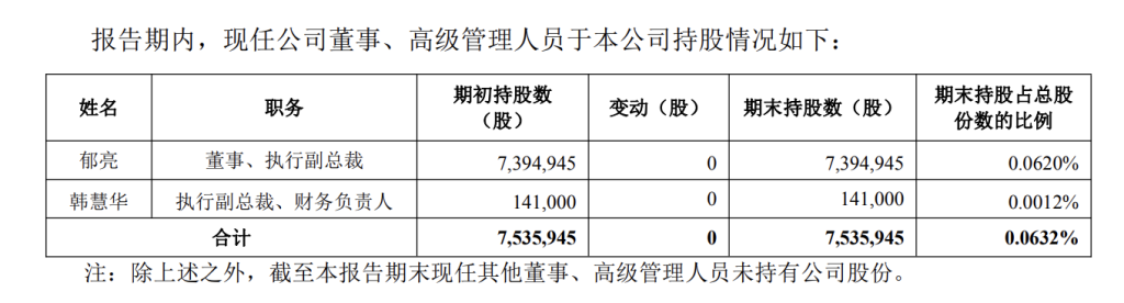 根據(jù)萬科2025年半年度報告,現(xiàn)任董事、執(zhí)行副總裁郁亮持股7,394,945股,占總股份數(shù)比例為0.0620%;執(zhí)行副總裁、財務(wù)負責人韓慧華持股141,000股,占總股份數(shù)比例為0.0012%。
