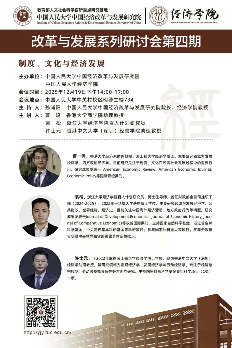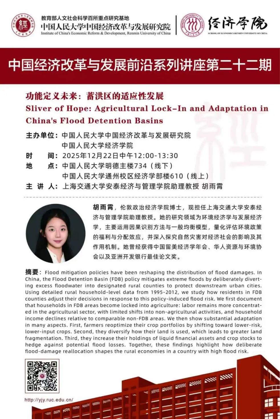參與方式:中國人民大學明德主樓734(線下)、中國人民大學通州校區(qū)經(jīng)濟學部樓610(線上)
