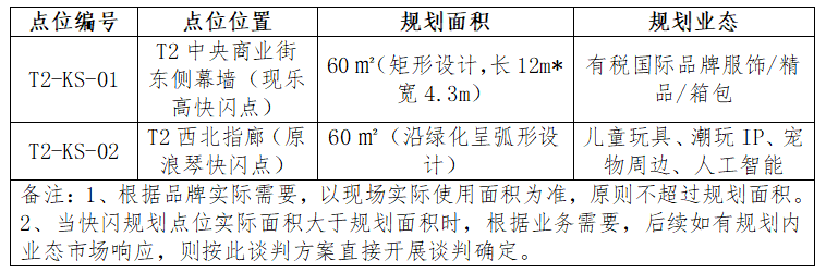 (1)品牌業(yè)態(tài)要求:擬引進(jìn)有稅業(yè)態(tài)國際品牌服飾、兒童玩具、人工智能、寵物周邊、文創(chuàng)潮玩精品等業(yè)態(tài)(此次快閃項(xiàng)目旨在創(chuàng)新激勵(lì)有稅商業(yè)品牌豐富,引進(jìn)現(xiàn)有T1、T2暫未運(yùn)營的有稅商業(yè)品牌,且不銷售特產(chǎn)業(yè)態(tài))。