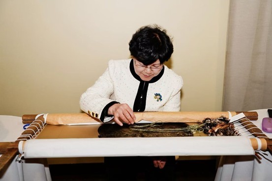 非遺傳承人鄭芬蘭及其女兒徐一可創(chuàng)作的《生生布息》系列,以玉米皮、葛、麻、棉等天然纖維手工織造而成,質(zhì)樸的材質(zhì)與精湛的技藝相得益彰。二人在聯(lián)合國(guó)總部展覽現(xiàn)場(chǎng)進(jìn)行紡織技藝演示,并將作品捐贈(zèng)給聯(lián)合國(guó)總部,成為文化交流的見證。
