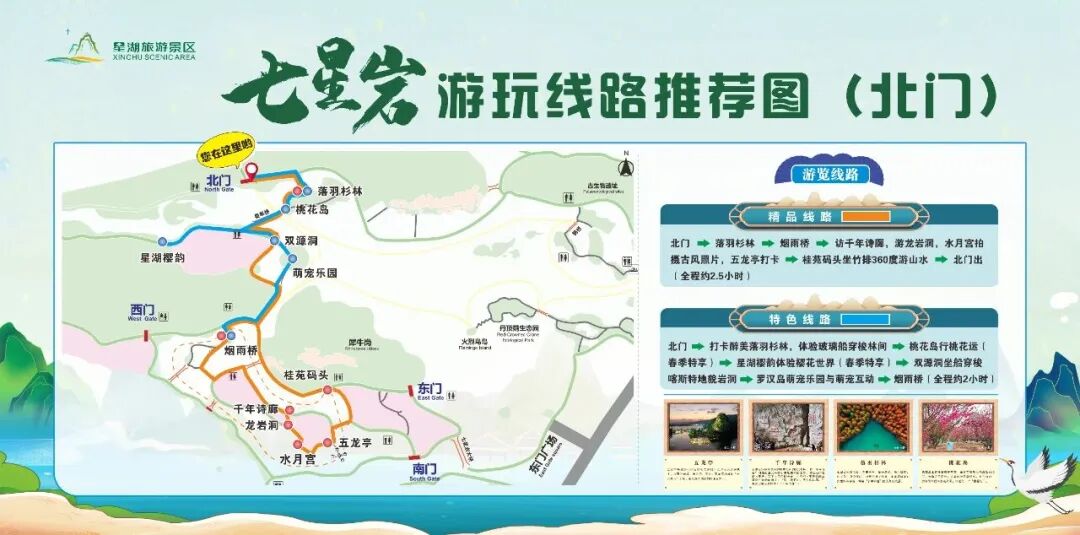 特色線路:北門(mén)→打卡醉美落羽杉林,體驗(yàn)玻璃船穿梭林間→桃花島行桃花運(yùn)(春季特享)→星湖櫻韻體驗(yàn)櫻花世界(春季特享)→雙源洞坐船穿梭喀斯特地貌巖洞→羅漢島萌寵樂(lè)園與萌寵互動(dòng)→煙雨橋(全程約2小時(shí),可接入常規(guī)線路繼續(xù)游覽)
