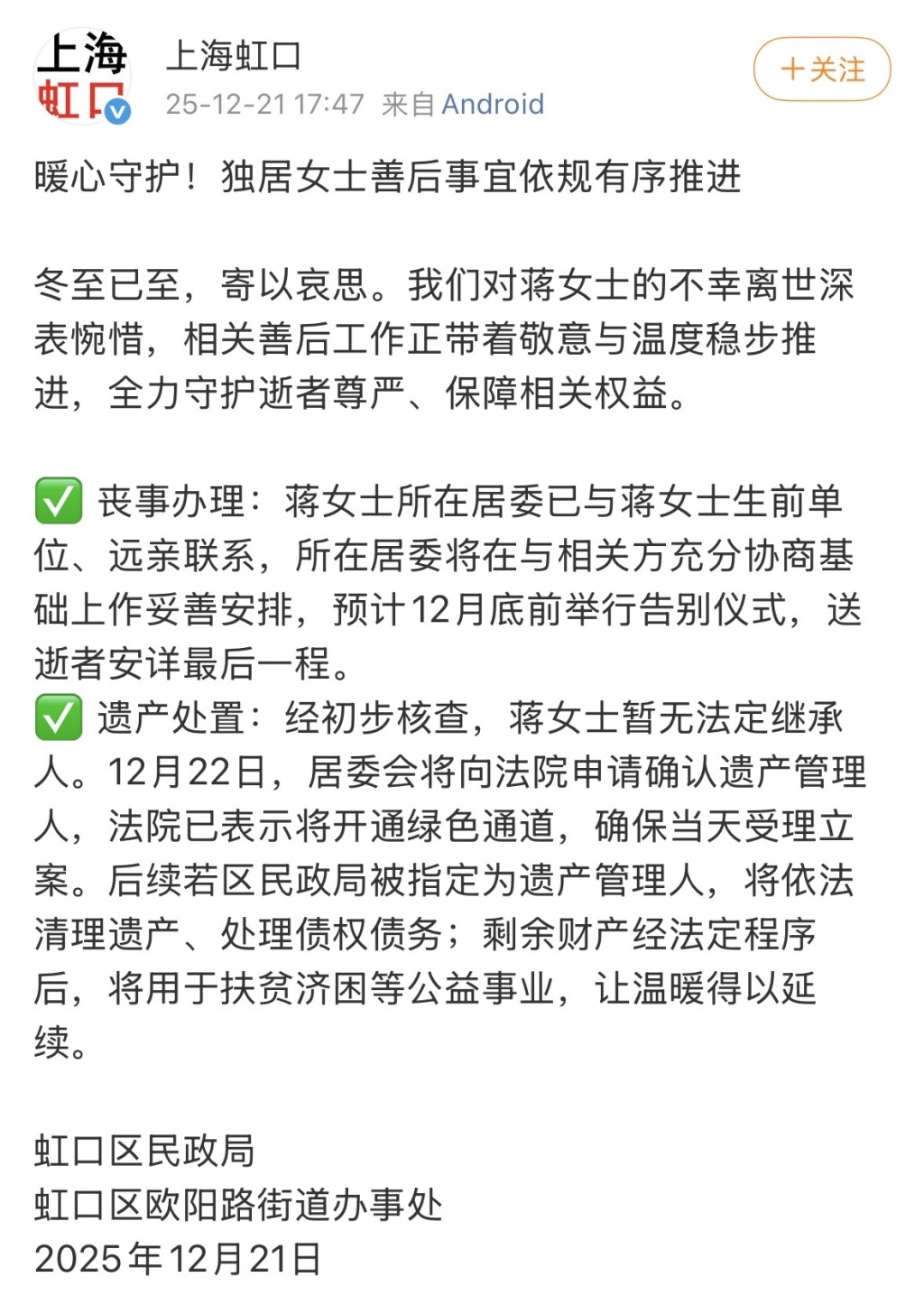 12月21日,@上海虹口 官方微博發(fā)布消息,對(duì)蔣女士的不幸離世深表惋惜,相關(guān)善后工作正帶著敬意與溫度穩(wěn)步推進(jìn),全力守護(hù)逝者尊嚴(yán)、保障相關(guān)權(quán)益。
