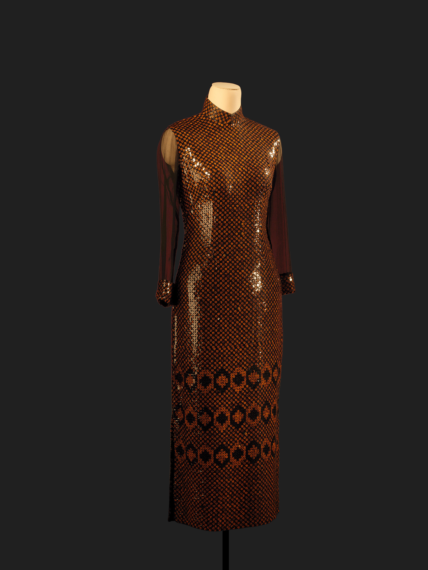 黑喬其紗地閃片繡幾何花卉紋旗袍 20世紀(jì)六七十年代 上海博物館藏 2021年貝洽女士捐贈(zèng) 1960s–1970s