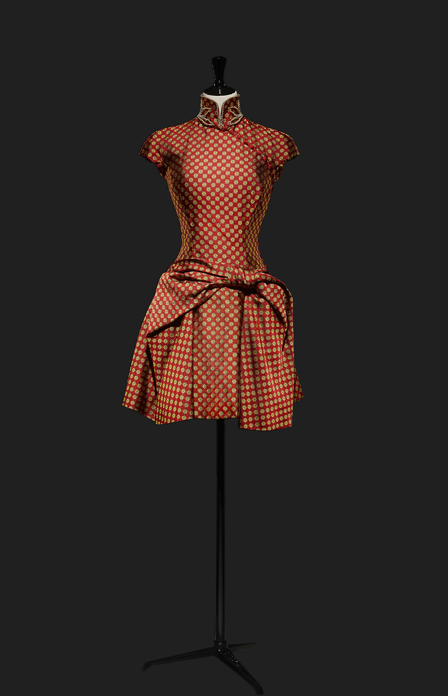 在迪奧設(shè)計(jì)師約翰·加里亞諾手中,中國旗袍被解構(gòu)重現(xiàn)為一場東西交融的時(shí)裝宣言。在1997年秋冬成衣系列一款禮服裙設(shè)計(jì)中,他選取港風(fēng)旗袍基本款樣,如立領(lǐng)、斜襟和仿珍珠裝飾等東方元素,同時(shí)改為左開襟并大膽地將裙身延展為波浪短裙,腰際斜系一結(jié),既呼應(yīng)傳統(tǒng)又打破常規(guī),既性感浪漫又颯爽活潑。面料上紅地菱格與黃瓣綠芯菊花交織,在似宋錦雅韻中注入歐式提花的現(xiàn)代活力。這一創(chuàng)作不僅重塑了旗袍的形態(tài),更讓東方美學(xué)成為國際時(shí)尚的靈感源泉,展現(xiàn)出文化交融的非凡魅力。