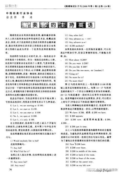 為什么我們的拍賣師較少去借鑒海外優(yōu)秀的主持風(fēng)格?原因之一也許是聽不懂那些快速多變的英語。為了幫助大家理解海外拍場的主持語,我曾為此用了很多心。上世紀(jì)90年代初在英國留學(xué)期間,我曾參加過十幾場拍賣會,初步對英式報價有所了解。1996年,借赴新加坡主持拍賣會的機(jī)會,我還順便去看了當(dāng)?shù)氐亩鄨雠馁u會。1998年,又到香港觀摩了佳士得、蘇富比的拍賣會,佳記林華田先生的優(yōu)雅主持給我留下了深刻印象。過后我又陸續(xù)到了紐約、倫敦、舊金山等地去觀摩拍賣。1997年,我將海外拍賣師的主持用語整理出來,以《淺談拍賣師的主持英語》為題,發(fā)文在當(dāng)年第2期的《中國翻譯》雜志上;1999年又為中拍協(xié)最早的拍賣師試用教材《全國拍賣師資格考試培訓(xùn)教材》以及隨后出版的正式教材《拍賣通論》中撰寫了《拍賣英語術(shù)語》一章。2000年,又寫下《拍賣師的主持英語》一文,發(fā)表在當(dāng)年第1期《英語知識》雜志上。希望能幫助更多的人學(xué)習(xí)和領(lǐng)會海外拍賣主持的語言特色。