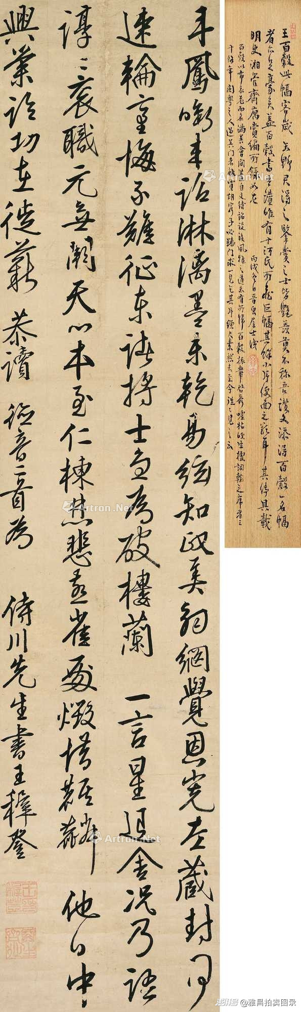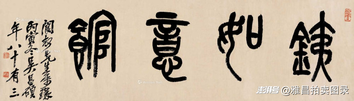 此外,明代趙南星為顯示抗閹黨決心,亦特意找人打制鐵如意,送予同人及門生,故鐵如意亦被視為“君子之器”,飽含卓犖氣節(jié)之大義。如意又有事事如意的美好祝福,寓意亦是極佳。吳昌碩橫幅書寫齋號(hào)尤為鮮見珍稀,為林朗庵寫“寶宋室”逾千萬(wàn)成交,可見市場(chǎng)之追捧。而本幅是西泠兩任社長(zhǎng)的交誼見證,亦是舊時(shí)文人對(duì)于節(jié)氣的追求、自勉。得此一紙,誠(chéng)可謂“撐天拔地,百煉一枝。把在吾手,春風(fēng)叢吹?!?/p>