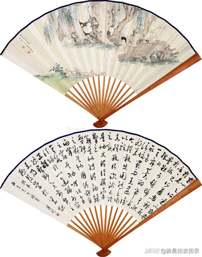 陳少梅的《柳蔭仕女》筆法工細(xì),姿態(tài)嫵媚,有明代仇英之風(fēng)。仕女身著淡色衣裝,坐于湖石旁,神態(tài)嫻靜;背景以細(xì)筆繪垂柳、坡岸、木橋,搭配淺綠、淡藍(lán)的設(shè)色,風(fēng)格清雅秀逸,是陳少梅典型的“北宗山水加工筆仕女”結(jié)合的畫風(fēng)。1944年作,是陳少梅藝術(shù)成熟期的作品。背面溥修以行草書書寫長(zhǎng)篇文字,字體舒展流暢,體現(xiàn)了溥修書法功底。扇骨刻有王雪濤花蟲,線條簡(jiǎn)練生動(dòng)。