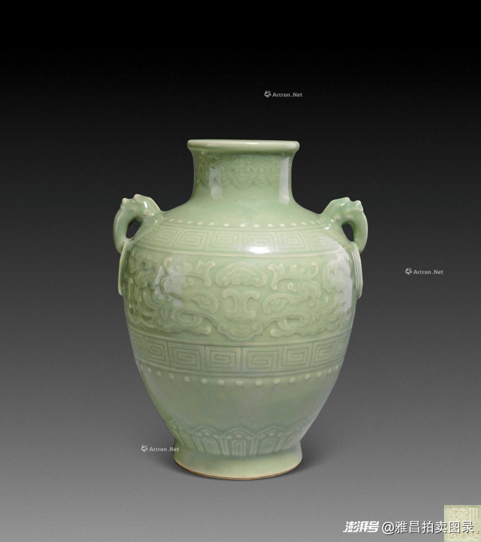 拍品造型摹古創(chuàng)新,仿銅器之造型,直口,肩部對(duì)稱裝飾雙獸耳銜環(huán),紋飾繁密,頸部裝飾如意紋一周,腹部回字紋、點(diǎn)紋、饕餮紋、蓮瓣紋層層裝飾,分有六層布局大氣敦厚,典雅高貴,為典型的乾隆時(shí)期作品。