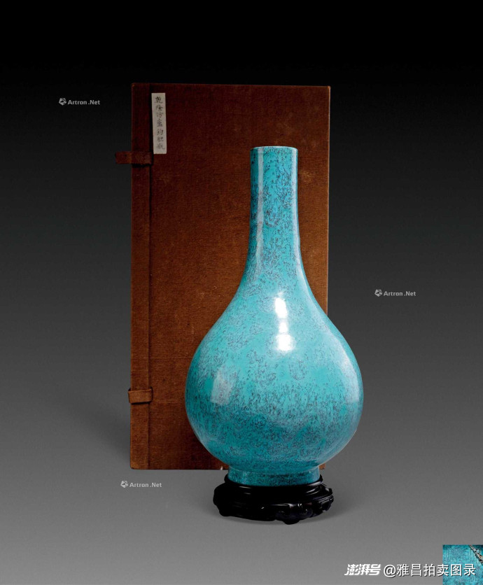 膽瓶因其形似垂膽而得名,屬于陳設(shè)器一般用于插花。本品小器大樣,形制端正,挺拔英立,瓶直口,長(zhǎng)頸,溜肩,腹部渾圓,腹下漸收至圈足。圈足露胎,黑色護(hù)胎釉與官窯刻款顯示其等級(jí),拍品胎堅(jiān)質(zhì)細(xì),通體滿施爐鈞釉,釉面勻凈潤(rùn)澤,釉色斑斕交織,別具意蘊(yùn)。乾隆時(shí)期爐鈞釉承襲雍正工藝與藝術(shù)傳統(tǒng),以色調(diào)較深的青金藍(lán)色與淺淡的松石綠色彼此相融,顏色多變而靚麗十足。沈葆楨家族舊藏。