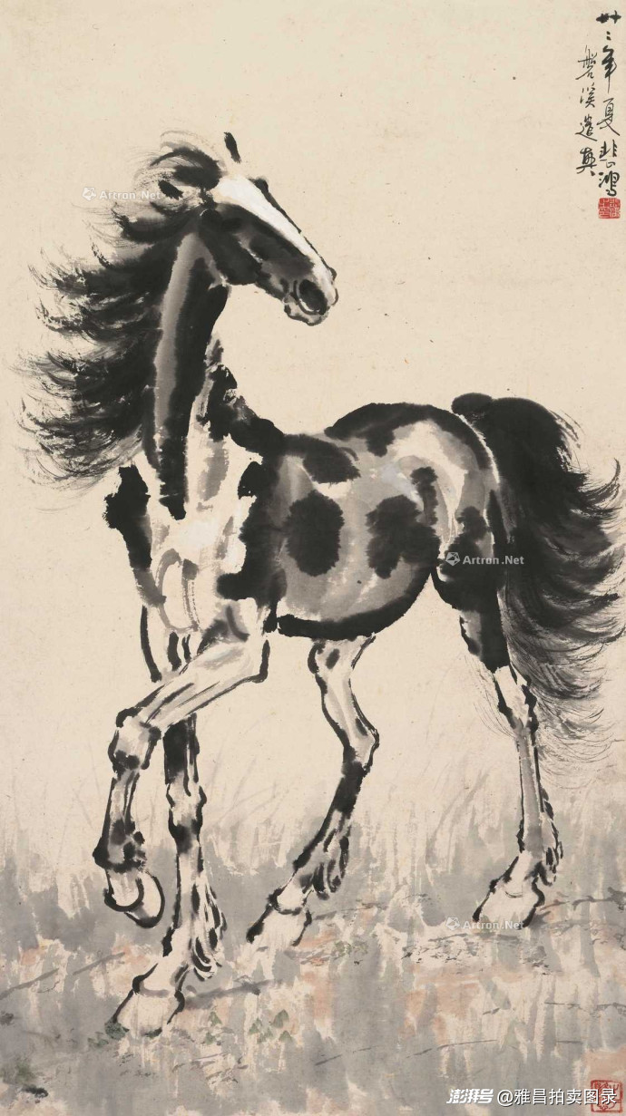 “盤溪遣興”表明這幅畫是徐悲鴻在重慶盤溪(當(dāng)時(shí)他在此主持中國(guó)美術(shù)學(xué)院工作)的即興創(chuàng)作。1943年夏,他正處于藝術(shù)創(chuàng)作的活躍期,此前剛從青城山寫生歸來(lái),創(chuàng)作狀態(tài)飽滿。徐悲鴻這幅駿馬,自右徐趨而左,前蹄微抬,倏然回首;鬃毛隨風(fēng)揚(yáng)起,似聞嘶鳴破紙。畫家以解剖學(xué)精準(zhǔn)寫其骨骼筋肉,又以書法筆意寫其神采。濃墨闊刷顯體積,飛白留痕見速度;焦墨勾鬃,濕墨染軀,濃淡間氣脈奔涌。馬身雖靜立,卻蓄千鈞待發(fā)之勢(shì),象征自由不屈、昂揚(yáng)向上的民族魂魄。