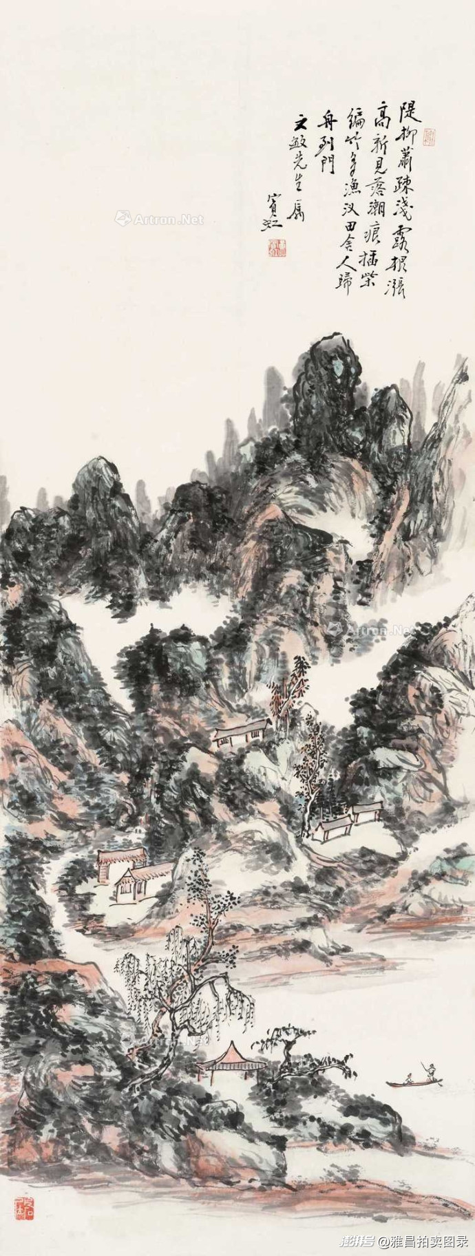 《柳堤漁隱》是黃賓虹晚年淺絳青綠山水的精品,此作為長(zhǎng)條縱軸,取景繁密,畫群山峻嶺,密樹層林。下方以留白為河流蜿蜒而上,走向呈“之”字型,和上方的空白云氣形成呼應(yīng),既為引人入勝之通途,又是分割畫面形式之手段。小橋、流水、人家、漁舟點(diǎn)綴其中,虛實(shí)、繁簡(jiǎn)、疏密統(tǒng)一自然。山石表現(xiàn)幾近于抽象繪畫,千筆萬(wàn)筆,重重疊疊,然皆一絲不茍,法度不亂。近視似草草,幾不類物象,卻“絕似又絕不似于物象”、“以不似之似為真似”,遠(yuǎn)觀此作如觀真景,如臨其境。整體看,此作筆墨運(yùn)用已臻化境。用筆如作篆籀,勁道有力;以點(diǎn)積線,絲絲入扣,沉穩(wěn)而不輕浮,流動(dòng)中有古拙之氣。筆、墨、色、渾融一體,不分彼此。墨不遮筆,筆不掩墨,筆有筆之妙處,墨有墨之美感,筆墨間滲透清亮空靈之感。整幅畫元?dú)饬芾?、渾厚華滋、意境深邃。在此畫中黃賓虹用點(diǎn)染法將石色的朱砂、石青、石綠厚厚地點(diǎn)染到黑密的水墨皴筆之中,這種畫法是受西方印象派啟發(fā),將中國(guó)山水畫兩大體系(水墨與青綠)進(jìn)行融合的一大創(chuàng)舉。賓翁自述“江山本如畫,內(nèi)美靜中參”,“丹青隱墨,墨隱丹青”,此圖可證之。