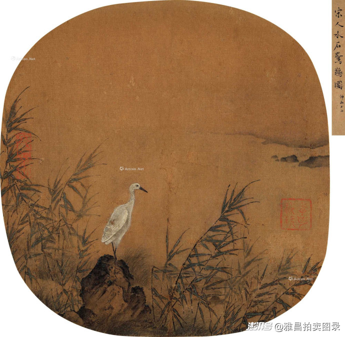 宋人《水石鷺鷥圖》,設(shè)色絹本,團(tuán)扇。高六寸七分,闊六寸六分,無(wú)款。畫面以一角蘚石為襯,白鷺蜷足而立,作窺魚之態(tài),秋水波光粼粼,意境清朗。此作屬兩宋“汀渚水鳥小景畫”傳統(tǒng),以蘆葦(諧音“祿”)與鷺鷥(諧音“路”)組合,暗喻“一路得祿”“福祿雙全”,同時(shí)通過鷺鷥孤高之姿與蘆葦勁挺之態(tài),象征文人雅士不慕名利、潔身自好的品格,契合宋人清曠淡泊的審美追求。蘆葦叢生喻兄弟同心,鷺鷥?nèi)壕悠碜訉O綿延,蒼茫蘆蕩與閑雅鷺影交融,傳遞“不盈咫尺而萬(wàn)里可論”的境界。