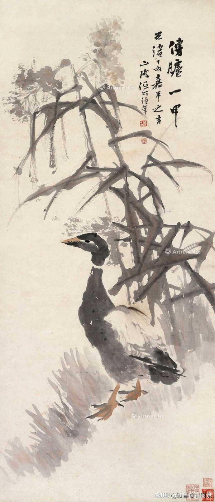 任伯年筆下的《三星拱壽》,堪稱晚清人物畫的神來(lái)之筆。畫面左下,壽星拄杖而立,高額白眉,素服內(nèi)暗襯繁花錦衣,側(cè)臉微笑,長(zhǎng)髯隨風(fēng);居中福星,手執(zhí)如意,取“五福臨門”之瑞;右側(cè)祿星朱袍加身,雙手捧幣,寓加官進(jìn)爵、財(cái)?shù)撠S盈之吉。三者神態(tài)互異,或慈、或喜、或莊,眉眼間閃露瞬間心緒,舉手投足皆富動(dòng)勢(shì),深得陳老蓮傳神三昧,亦見任伯年捕捉形神的高超本領(lǐng)。線條更見功力,衣紋用釘頭鼠尾描,起筆頓挫如刀,收筆輕曳似絲,粗細(xì)起伏間既塑骨骼,又寫情緒;衣紋曲線,則若琴瑟輕彈,韻律自生。色彩上紅與灰、濃與淡的碰撞,使畫面響亮而不俗,層次躍然。構(gòu)圖采用“三角”呼應(yīng):壽星傾杖成斜勢(shì),福星居中為重心,祿星捧幣外張,三者氣脈相貫,留白處更顯呼吸,緊湊中見空靈。作為“晚清畫苑第一家”,任伯年此幀不僅集工筆、寫意、重彩、淡渲于一爐,更把民間吉慶題材提升到雅俗共賞的新高度,既見傳統(tǒng)功深,又具時(shí)代鮮活,百余年后再瞻,仍覺神采照人。