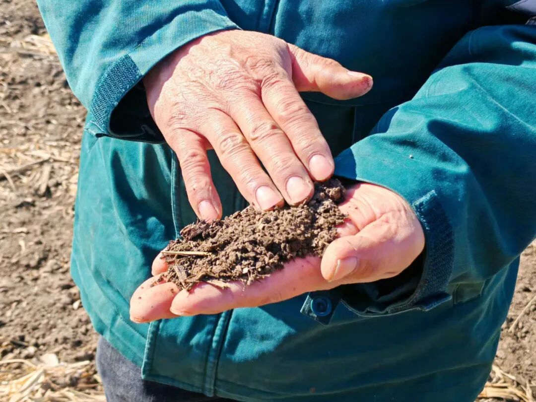 在九臺(tái)區(qū)興隆街道小荒村的農(nóng)田里,德強(qiáng)種植業(yè)家庭農(nóng)場負(fù)責(zé)人潘丙國抓起一把黑土,講解保護(hù)性耕作秸稈覆蓋條帶耕作模式的優(yōu)勢(shì)。