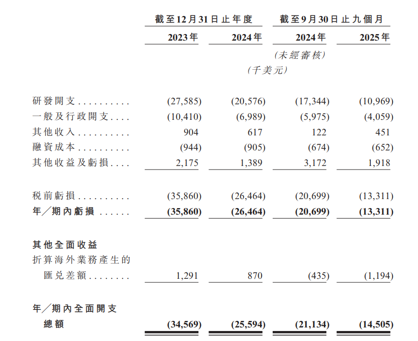目前,芳拓生物還沒(méi)有商業(yè)化產(chǎn)品。業(yè)績(jī)方面,截至2023年及2024年12月31日止年度,公司期內(nèi)虧損分別為3590萬(wàn)美元、2650萬(wàn)美元,2025年前九個(gè)月錄得虧損1330萬(wàn)美元。此次港股募資擬用于兩款核心產(chǎn)品的持續(xù)臨床研發(fā)活動(dòng),以及早期管線項(xiàng)目的研發(fā)等。