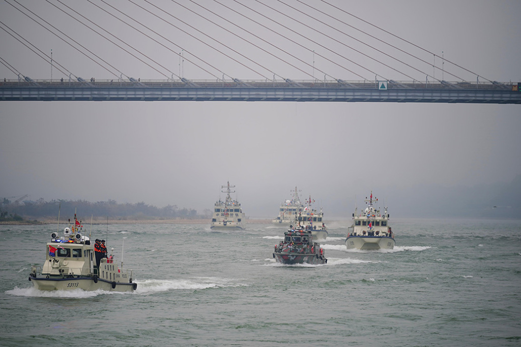 本次演練由水上分列式和聯(lián)合實戰(zhàn)演練兩部分組成。分列式上,4架無人機(jī)懸掛中老緬泰四國國旗從演練水域上空莊嚴(yán)飛過,中國、老撾、緬甸三國共10艘執(zhí)法艇拉響汽笛,依次從主席臺前方水域駛過并接受檢閱?,F(xiàn)場解說員以四國語言介紹接受檢閱的執(zhí)法艇及所獲榮譽(yù),參演隊員精神抖擻、斗志昂揚。聯(lián)合實戰(zhàn)演練以打擊跨境違法犯罪為背景,中老緬泰四國執(zhí)法部門在接到線索后,立即啟動處置突發(fā)事件預(yù)案,聯(lián)合開展水上查緝等行動,共設(shè)置了水上機(jī)動攔截、水下涉案物品打撈等8個科目。