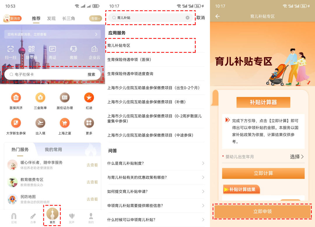 實名注冊并登錄“隨申辦市民云”APP→首頁搜索關(guān)鍵字“育兒補貼”→點擊“育兒補貼專區(qū)”進入服務(wù)頁面→點擊“立即申請”;