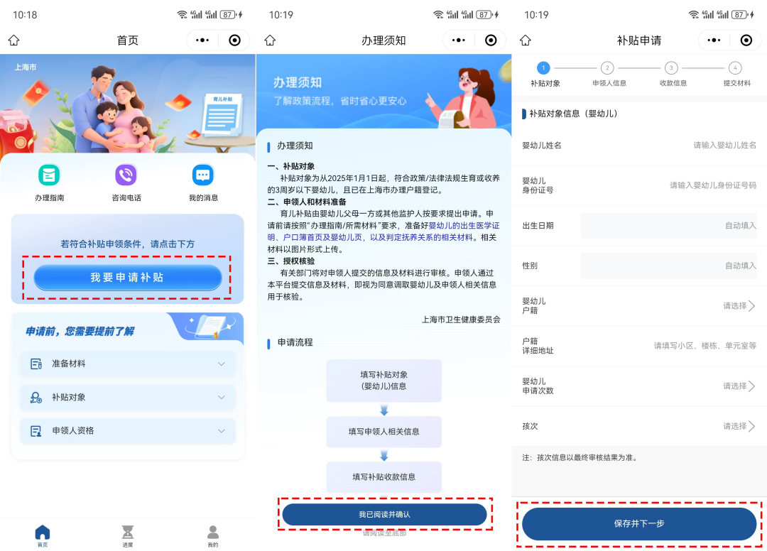 填寫信息包括:提供嬰幼兒的出生醫(yī)學證明、居民戶口簿、婚姻證明、補貼收款信息等材料,并對所提供信息及材料的真實性、完整性做出承諾→點擊“確認提交”后,耐心等待審核結(jié)果即可。
