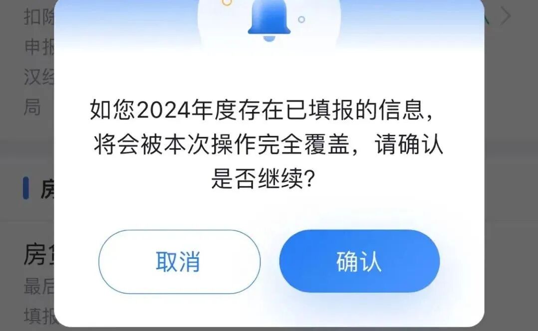 依據(jù)提示“如您2024年度存在已填報的信息,將會被本次操作完全覆蓋,請確認是否繼續(xù)?”,確認后點擊“確認”。