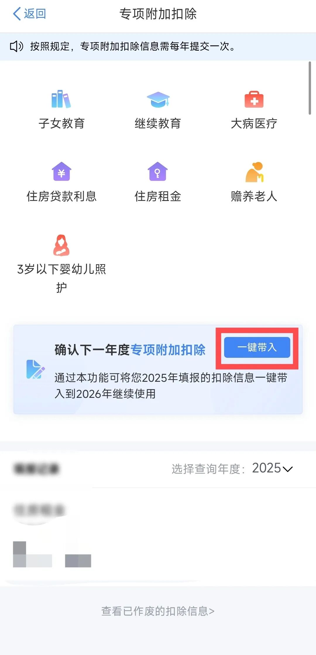第二步:進入該功能界面,“確認下一年度專項附加扣除”,點擊“一鍵帶入”。