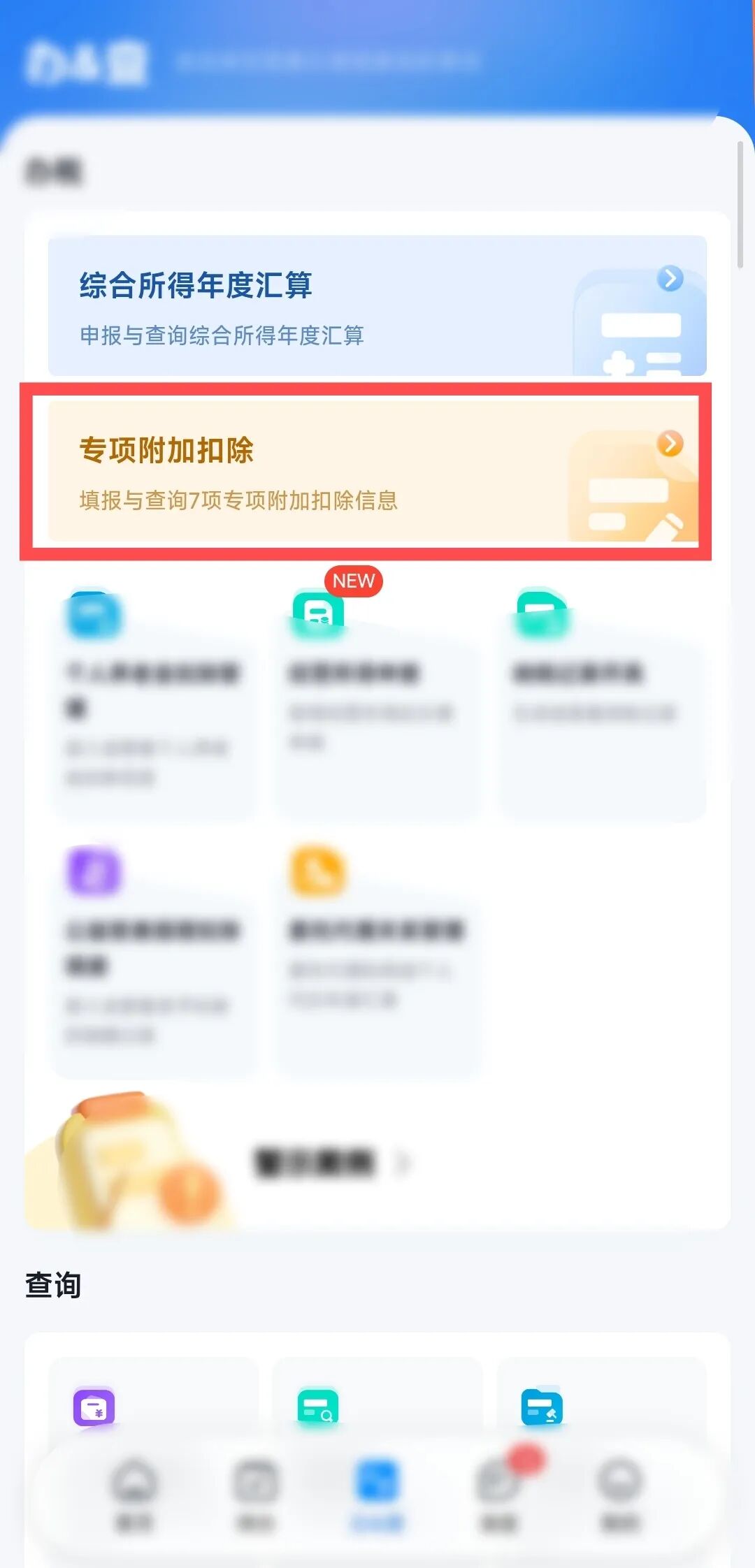 第一步:打開個稅APP首頁點擊首頁海報“去確認”按鈕,或者底部欄“辦&查”——“專項附加扣除填報”,進入功能界面。