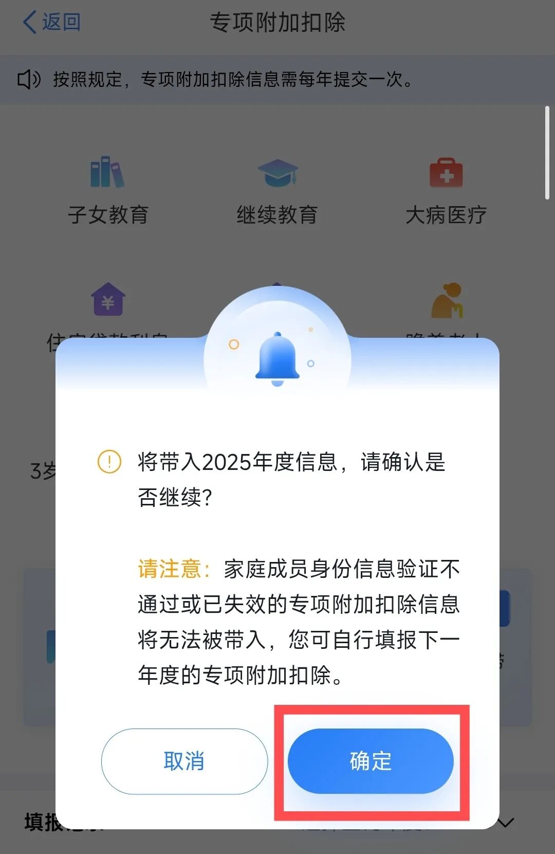 第三步:根據(jù)提示“將帶入2025年度信息,請確認是否繼續(xù)?”,確認后點擊“確定”。