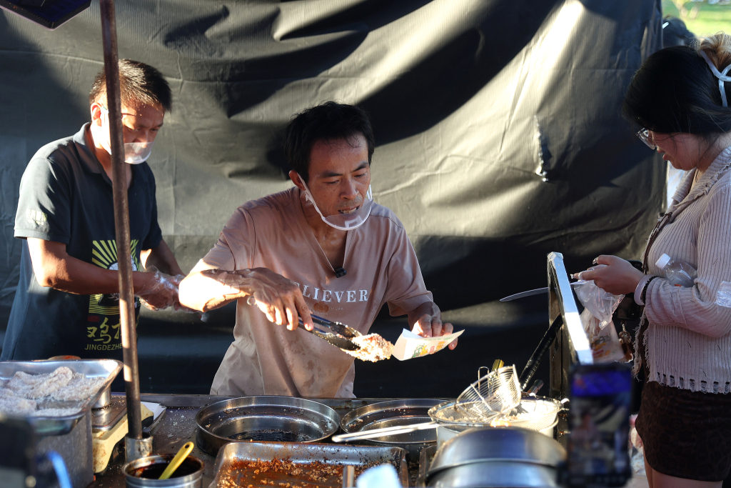 2025年10月6日,江西景德鎮(zhèn),“雞排哥”李俊永正在攤位前為顧客制作美食。圖源視覺中國
