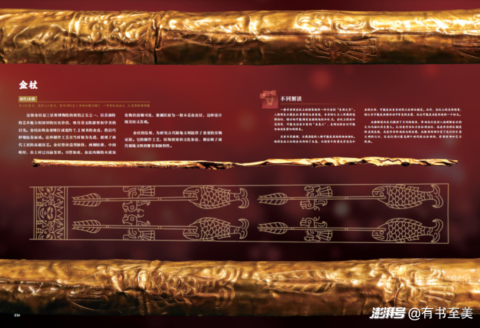 他將象征王權(quán)的金杖傳給了魚鳧,而圖案中的箭矢穿透鳥和魚的頭部,象征當(dāng)時的王位禪讓制。