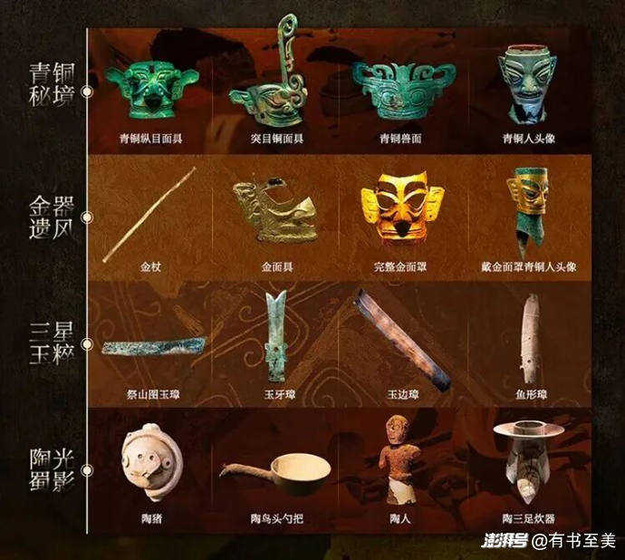青銅神樹、青銅縱目面具、黃金面罩、黃金權(quán)杖、玉戈、玉琮……