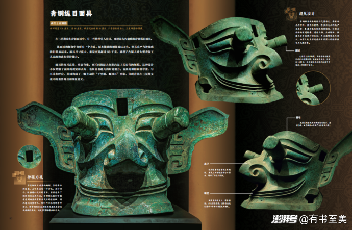 比如這件氣勢非凡的青銅縱目面具,書中特別指出它靠近耳朵的位置,
