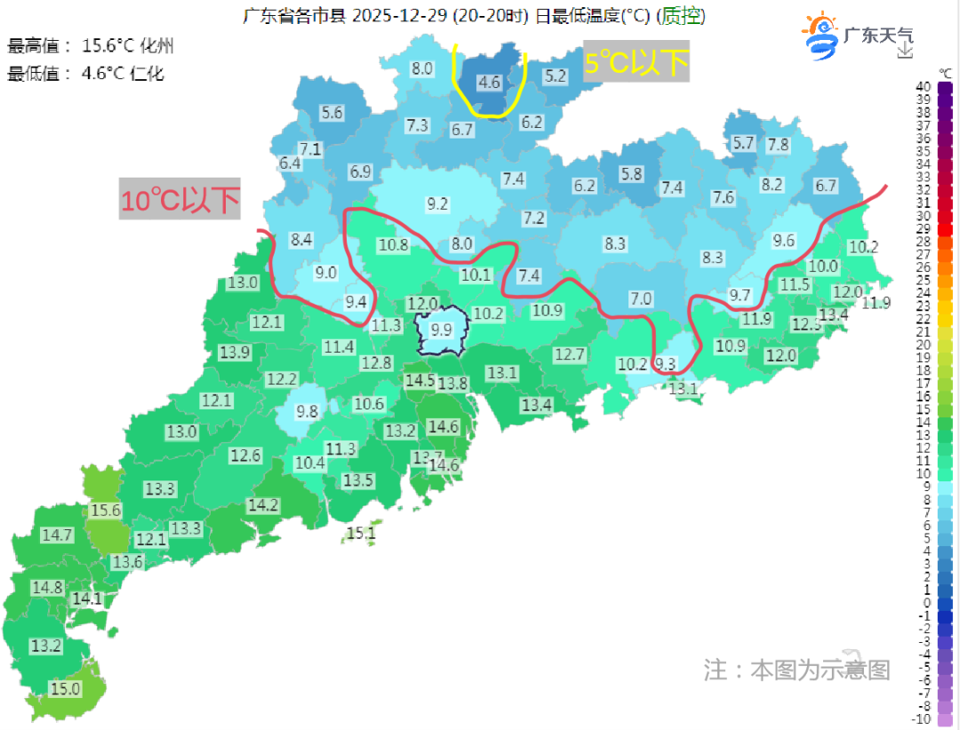 (12月29日早晨最低氣溫:粵北、珠三角北部市縣介于5~10℃,珠三角南部和粵西沿海市縣介于12~16℃,其余大部分市縣介于10~12℃,其中韶關(guān)仁化錄得全省最低氣溫4.6℃。)