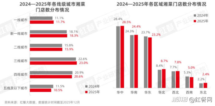 在門店分布方面,近兩年湘菜門店在不同線級城市與區(qū)域的結(jié)構(gòu)分布整體趨于穩(wěn)定。具體來看,三線城市、四線城市的湘菜門店數(shù)占比均超過20%,其他線級城市的湘菜門店數(shù)占比均在10%以上。其中,一線城市、新一線城市、二線城市以及三線城市的湘菜門店數(shù)占比均有微弱上升。從區(qū)域上看,華中、華南與華東仍是湘菜門店最為集中的三大區(qū)域,門店數(shù)占比均超過20%。